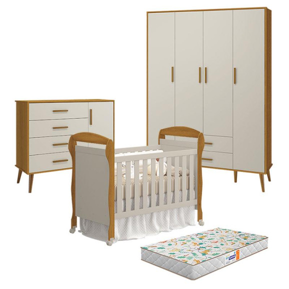 Quarto de Bebê 4 Portas com Cômoda com Porta Isis e Berço Americano Danny Areia Savana Acetinado com Colchão Gazin - Reller