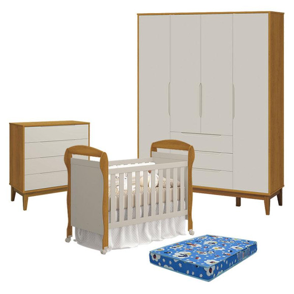 Quarto de Bebê 4 Portas com Cômoda Gaveteiro Elfe Classic e Berço Americano Danny Areia Savana Acetinado Amadeirado com Colchão Ortobom - Reller