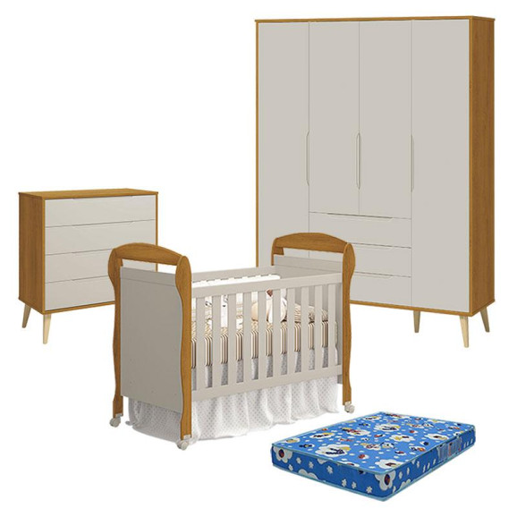Quarto de Bebê 4 Portas com Cômoda Gaveteiro Elfe Retrô e Berço Americano Danny Areia Savana Acetinado Natural com Colchão Ortobom - Reller