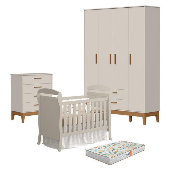 O Quarto de Bebê 4 Portas com Cômoda Gaveteiro Flip e Berço Americano Danny Areia Acetinado com Colchão Gazin - Reller é a escolha perfeita para um ambiente completo, sofisticado e funcional. Com acabamento elegante em areia acetinado, o berço garante segurança e conforto, acompanhado do colchão Gazin que proporciona suporte ideal para noites mais tranquilas. O guarda-roupa 4 portas oferece amplo espaço para organização, enquanto a cômoda gaveteiro com porta flip traz praticidade e versatilidade no dia a dia, criando um quarto harmonioso e acolhedor para o seu bebê.