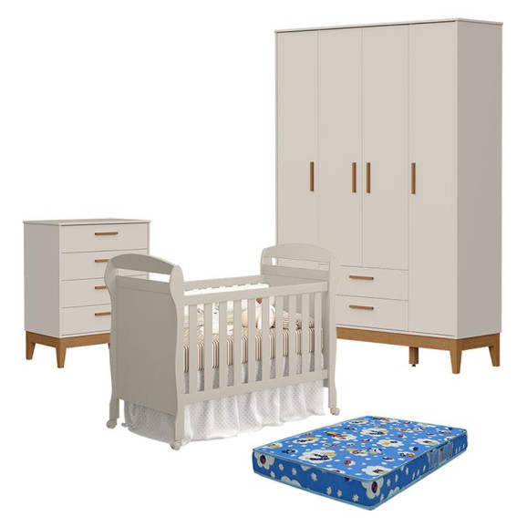 Quarto de Bebê 4 Portas com Cômoda com Porta Flip e Berço Americano Danny Areia Acetinado com Colchão Tend Tudo - Reller