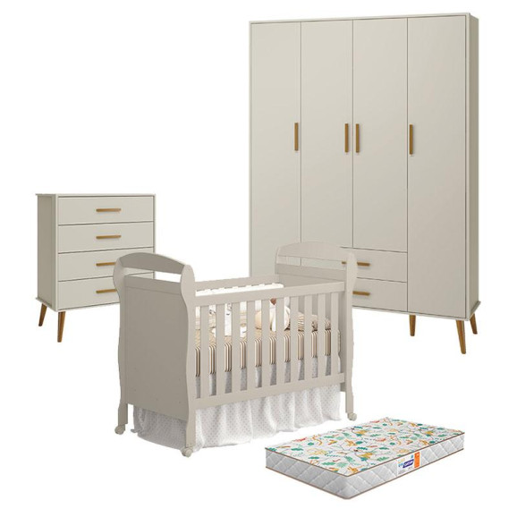 O Quarto de Bebê 4 Portas com Cômoda Gaveteiro Isis e Berço Americano Danny Areia Acetinado com Colchão Gazin - Reller é a solução completa para um ambiente moderno, funcional e acolhedor. Com acabamento sofisticado em areia acetinado, o berço oferece segurança e conforto, acompanhado do colchão Gazin que garante suporte ideal para noites tranquilas. O guarda-roupa 4 portas proporciona amplo espaço para organização, enquanto a cômoda gaveteiro Isis traz praticidade e versatilidade no dia a dia, criando um quarto harmonioso e cheio de charme para o seu bebê.