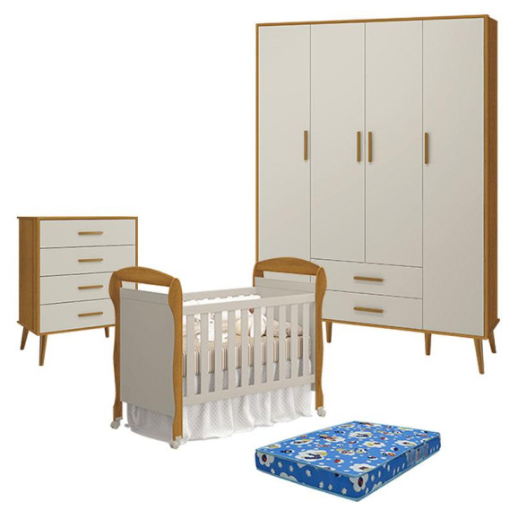 Quarto de Bebê 4 Portas com Cômoda Gaveteiro Isis e Berço Americano Danny Areia Savana Acetinado com Colchão Ortobom - Reller