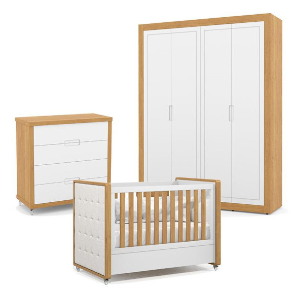 Quarto de Bebe 4 Portas Tutto New com Capitonê New Boucle e Gaveteiro Freijó Branco Acetinado - Matic