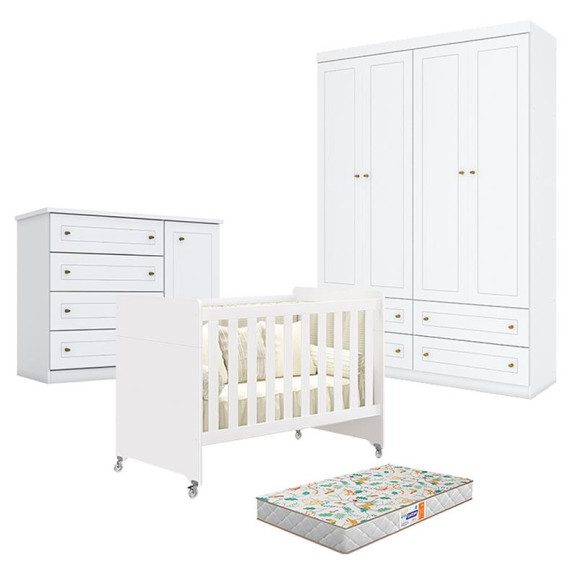Quarto de Bebê Americano 4 Portas com Berço Americano Evolution 4 em 1 Branco Acetinado com Colchão Gazin.
