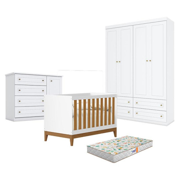 Quarto de bebê composto por Berço Americano Flip Branco Acetinado Savana Reller, Guarda-Roupa Americano 4 Portas Henn e Cômoda Infantil Americano. O berço oferece conforto e segurança para o bebê, com acabamento branco acetinado e detalhe Savana. O guarda-roupa garante boa organização do enxoval, enquanto a cômoda complementa o ambiente com praticidade para roupas e acessórios. Ideal para montar um quarto de bebê funcional, moderno e aconchegante. Acompanha Colhcão Gazin.