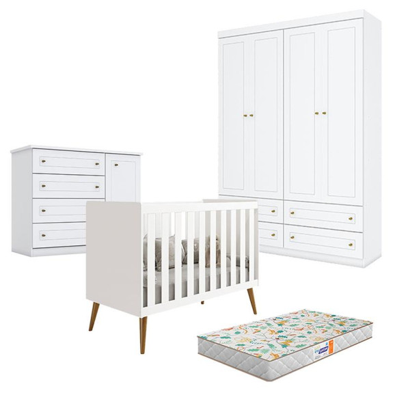 Quarto de Bebê Americano 4 Portas com Berço Americano Isis Branco Acetinado Reller com Colchão Gazin - Henn