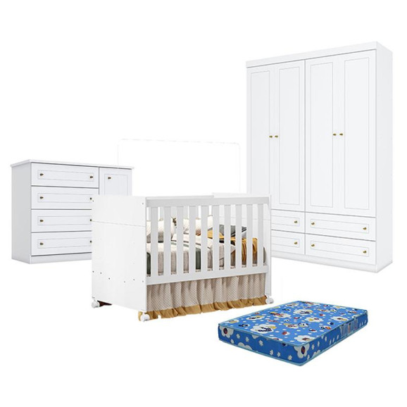 Quarto de bebê composto por Berço Americano Katatau Branco Acetinado Reller, Guarda-Roupa Americano 4 Portas Henn e Cômoda Infantil Americano Branco. O berço apresenta estrutura resistente e acabamento branco acetinado, garantindo conforto e segurança para o bebê. O guarda-roupa oferece bom espaço interno para organização do enxoval, enquanto a cômoda americana branca complementa o ambiente com praticidade para armazenar roupas e acessórios. Ideal para montar um quarto de bebê funcional, elegante e aconchegante. Acompanha Colchão Ortobom.