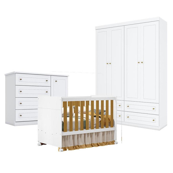 Quarto de bebê composto por Berço Americano Katatau Branco Acetinado Savana Reller, Guarda-Roupa Americano 4 Portas Henn e Cômoda Infantil Americano Branco. O berço apresenta estrutura resistente e acabamento branco acetinado com detalhe Savana, garantindo conforto e segurança para o bebê. O guarda-roupa oferece bom espaço interno para organização do enxoval, enquanto a cômoda americana branca complementa o ambiente com praticidade para armazenar roupas e acessórios. Ideal para montar um quarto de bebê funcional, elegante e aconchegante.