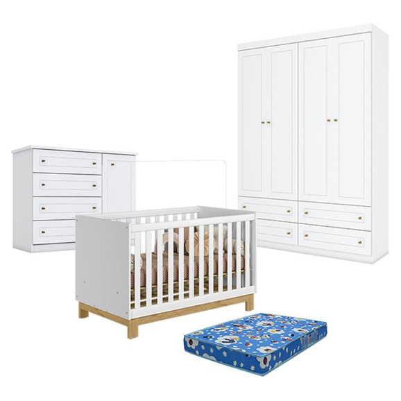 Quarto de Bebê Americano 4 Portas com Berço Americano Mini Cama Q Encanto Slim Branco Acetinado - Qmovi - Henn com Colchão TendTudo.