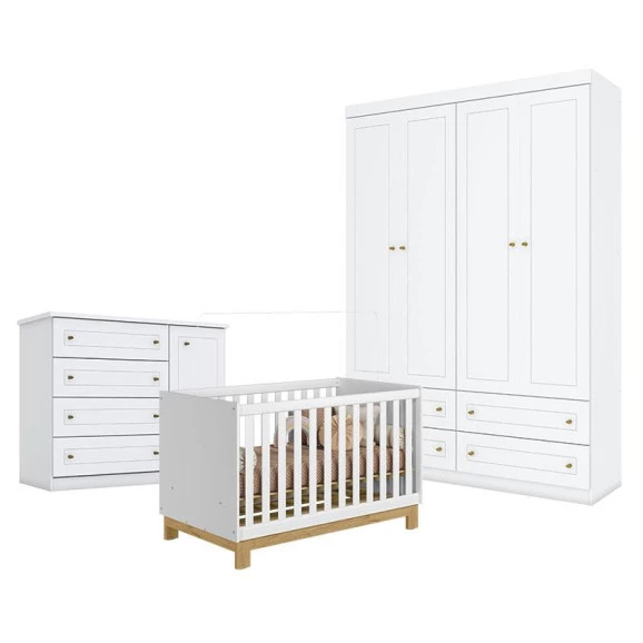 Quarto de bebê composto por Berço Americano Mini Cama Q Encanto Slim Branco Acetinado Qmovi, Guarda-Roupa Americano 4 Portas Henn e Cômoda Infantil Americano. O berço mini cama oferece praticidade e maior aproveitamento ao longo do crescimento da criança, com estrutura resistente e acabamento branco acetinado. O guarda-roupa garante boa organização do enxoval, enquanto a cômoda complementa o ambiente com funcionalidade para roupas e acessórios. Ideal para montar um quarto de bebê moderno, funcional e aconchegante.