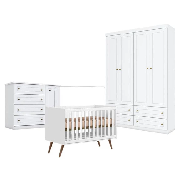 Quarto de bebê composto por Berço Americano Q Encanto 3820 Retrô Branco Acetinado Qmovi, Guarda-Roupa Americano 4 Portas Henn e Cômoda Infantil Americano. O berço apresenta design retrô, estrutura resistente e acabamento branco acetinado, garantindo conforto e segurança para o bebê. O guarda-roupa oferece bom espaço interno para organização do enxoval, enquanto a cômoda complementa o ambiente com praticidade para roupas e acessórios. Ideal para montar um quarto de bebê funcional, elegante e aconchegante.