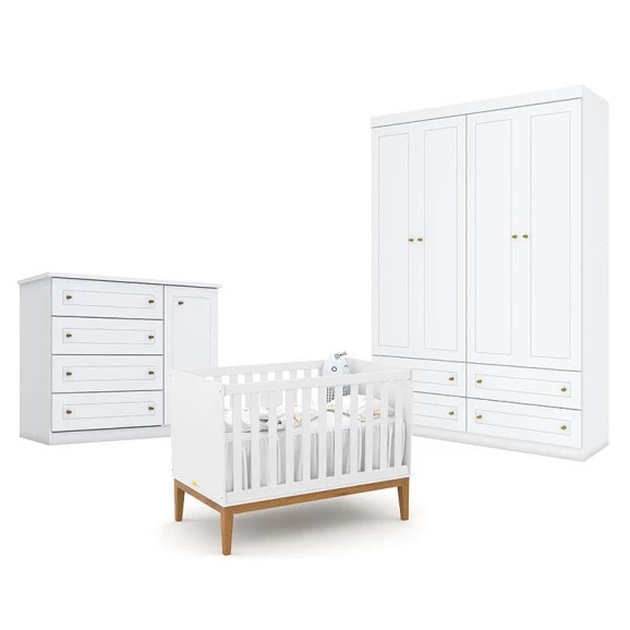 Quarto de Bebê Americano 4 Portas com Berço Americano Unique Branco Soft Eco Wood – Matic / Henn, composto por berço americano, guarda-roupa infantil americano de 4 portas e cômoda infantil americano, em branco - HP. Ideal para criar um ambiente aconchegante, funcional e bem organizado. O berço oferece conforto e segurança ao bebê, enquanto o guarda-roupa e a cômoda garantem praticidade no dia a dia. Acabamento Branco Soft com Eco Wood, com design moderno e excelente qualidade.