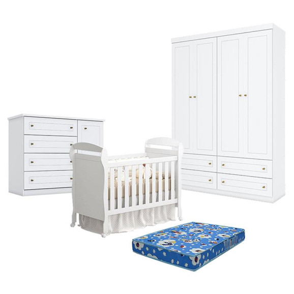 Quarto de Bebê Americano 4 Portas com Berço Danny Branco Acetinado Reller com Colchão TendTudo - Henn