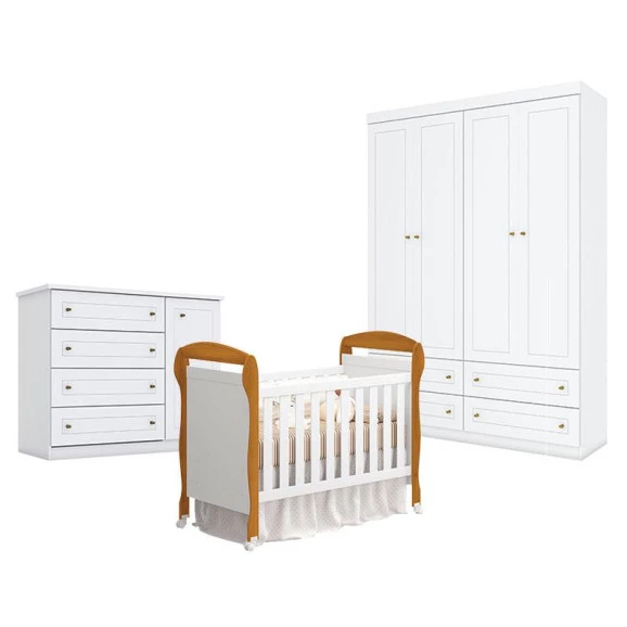 Quarto de bebê composto por Berço Danny Branco Acetinado Savana Reller, Guarda-Roupa Americano 4 Portas Henn e Cômoda Infantil Americano. O berço possui estrutura resistente e acabamento branco acetinado com detalhe Savana, garantindo conforto e segurança para o bebê. O guarda-roupa oferece bom espaço interno para organização do enxoval, enquanto a cômoda complementa o ambiente com praticidade para armazenar roupas e acessórios. Ideal para montar um quarto de bebê funcional, elegante e aconchegante.
