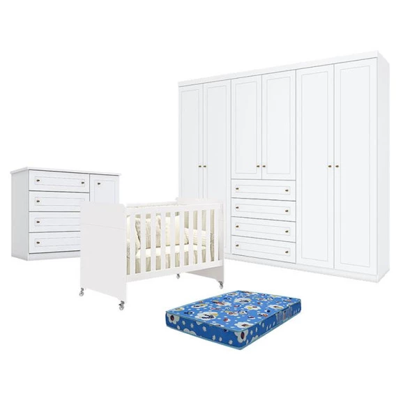 Quarto de bebê composto por Berço Americano Evolution 4 em 1 Branco Acetinado Reller, Guarda-Roupa Americano 6 Portas Henn e Cômoda Infantil Americano. O berço 4 em 1 acompanha o crescimento da criança, oferecendo versatilidade, conforto e segurança em todas as fases. O guarda-roupa de 6 portas garante amplo espaço interno para organização do enxoval, enquanto a cômoda complementa o ambiente com praticidade para roupas e acessórios. Ideal para um quarto de bebê funcional, elegante e bem organizado. Acompanha Colchão Ortobom
