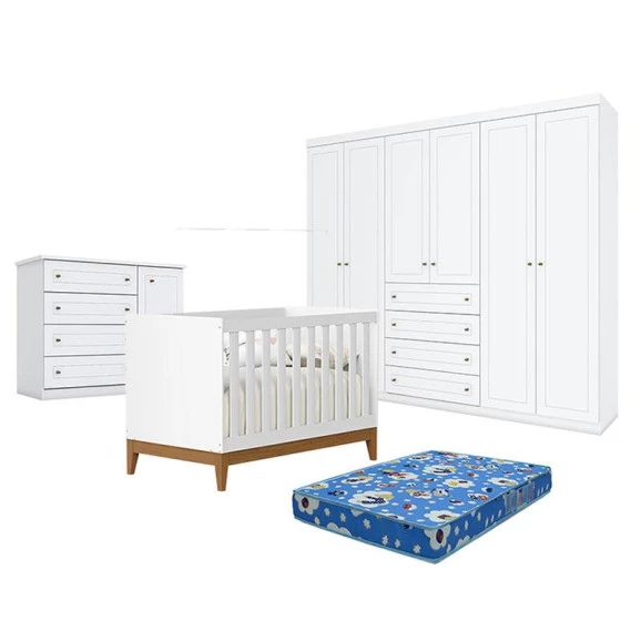 Quarto de bebê composto por Berço Americano Flip Branco Acetinado Reller, Guarda-Roupa Americano 6 Portas Henn e Cômoda Infantil Americano. O berço oferece conforto e segurança para o bebê, com estrutura firme e acabamento branco acetinado. O guarda-roupa de 6 portas proporciona amplo espaço interno para organização do enxoval, enquanto a cômoda complementa o ambiente com praticidade para roupas e acessórios. Ideal para um quarto de bebê funcional, elegante e bem organizado. Acompanha Colchão Ortobom.