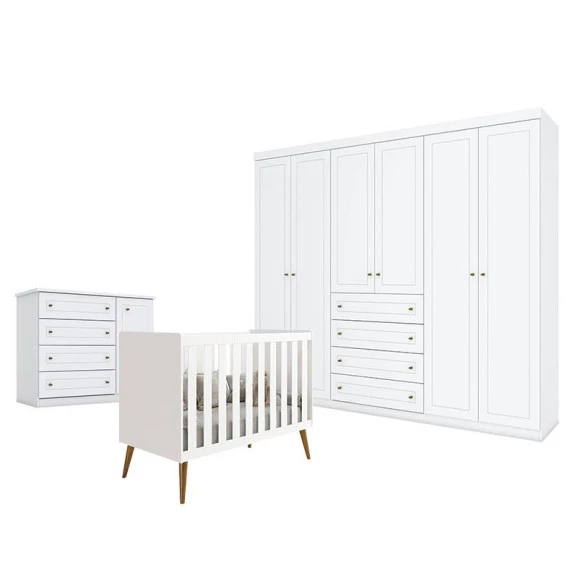 Quarto de Bebê Americano 6 Portas com Berço Americano Isis Branco Acetinado - Reller - Henn