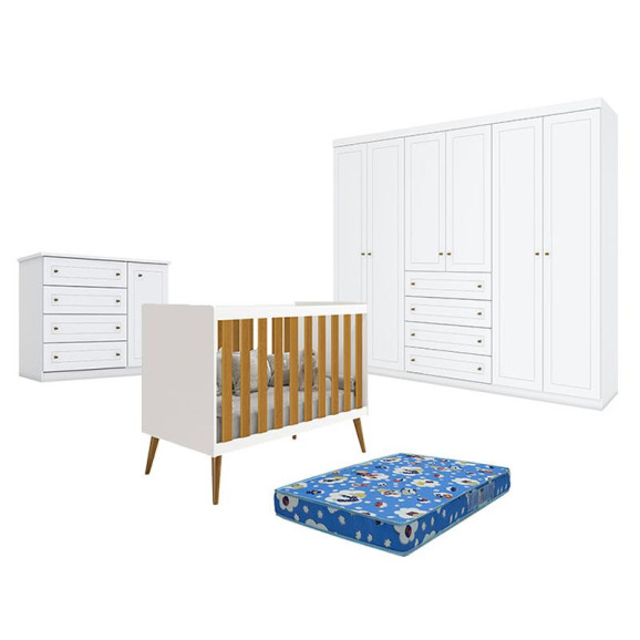 Quarto de Bebê Americano 6 Portas com Berço Americano Isis Branco Acetinado Savana com Colchão TendTudo - Reller - Henn