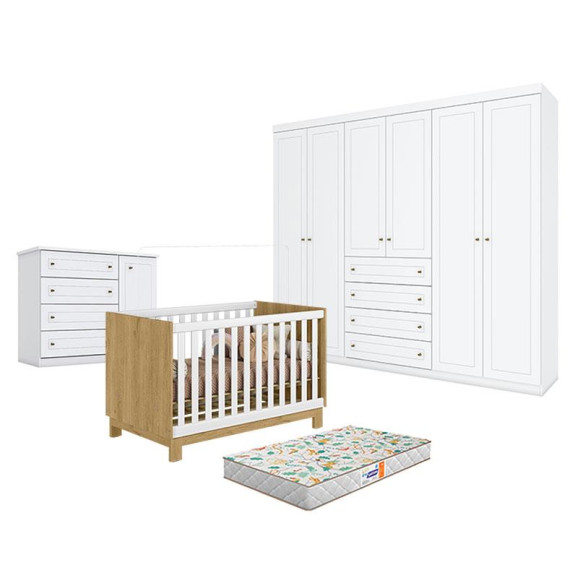Quarto de bebê composto por Berço Americano Mini Cama Q Encanto Slim Freijó Branco Acetinado Qmovi, Guarda-Roupa Americano 6 Portas Henn e Cômoda Infantil Americano. O berço mini cama acompanha o crescimento da criança, unindo praticidade, segurança e design moderno com detalhe em Freijó. O guarda-roupa de 6 portas oferece excelente espaço interno para organização do enxoval, enquanto a cômoda completa o ambiente com funcionalidade para roupas e acessórios. Ideal para montar um quarto de bebê elegante, funcional e bem organizado. Acompanha Colhcão Gazin.