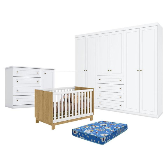 Quarto de Bebê Americano 6 Portas com Berço Americano Mini Cama Q Encanto Slim Freijó Branco Acetinado - Qmovi - Henn com Colchão TendTudo.