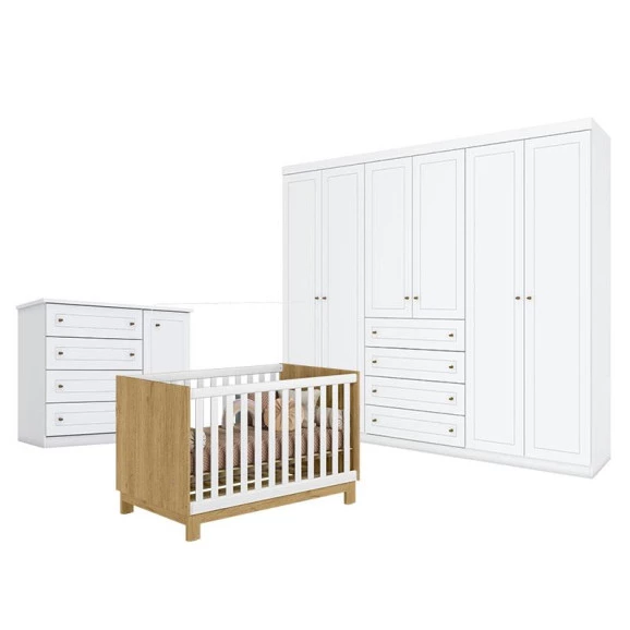 Quarto de bebê composto por Berço Americano Mini Cama Q Encanto Slim Freijó Branco Acetinado Qmovi, Guarda-Roupa Americano 6 Portas Henn e Cômoda Infantil Americano. O berço mini cama acompanha o crescimento da criança, unindo praticidade, segurança e design moderno com detalhe em Freijó. O guarda-roupa de 6 portas oferece excelente espaço interno para organização do enxoval, enquanto a cômoda completa o ambiente com funcionalidade para roupas e acessórios. Ideal para montar um quarto de bebê elegante, funcional e bem organizado.