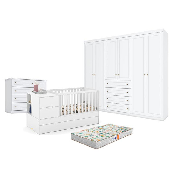 Quarto de Bebê Americano 6 Portas com Berço Americano Multifuncional Formare Branco Acetinado – Matic - Henn com Colchão Gazin.