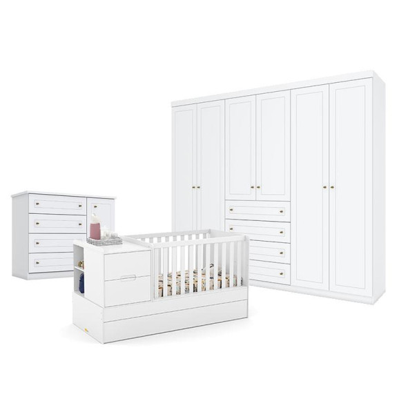 Quarto de Bebê Americano 6 Portas com Berço Americano Multifuncional Formare Branco Acetinado – Matic - Henn