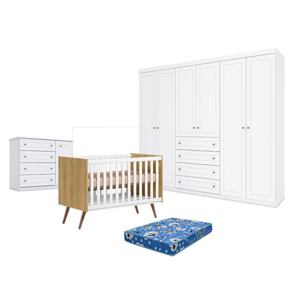 Quarto de bebê composto por Berço Americano Q Encanto 3820 Retrô Freijó TOQ Branco Acetinado Qmovi, Guarda-Roupa Americano 6 Portas Henn e Cômoda Infantil Americano. O berço apresenta design retrô com detalhe em Freijó TOQ, estrutura resistente e acabamento branco acetinado, garantindo conforto e segurança para o bebê. O guarda-roupa de 6 portas oferece excelente espaço interno para organização do enxoval, enquanto a cômoda complementa o ambiente com praticidade para roupas e acessórios. Ideal para montar um quarto de bebê funcional, elegante e bem organizado. Acompanha Colchão Ortobom.