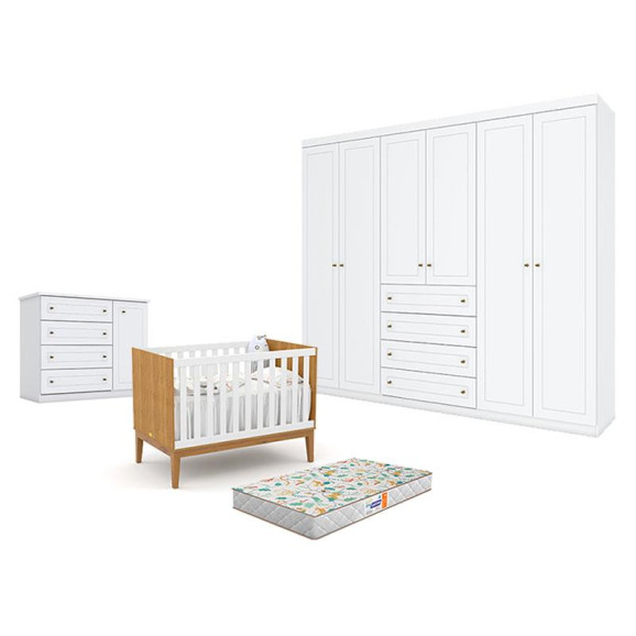 Quarto de Bebê Americano 6 Portas com Berço Americano Unique Freijó Branco Soft Eco Wood - Matic - Matic com Colchão Gazin