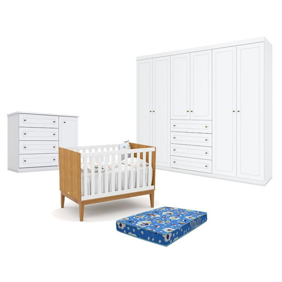 Quarto de Bebê Americano 6 Portas com Berço Americano Unique Freijó Branco Soft Eco Wood - Matic - Matic com Colchão Ortobom