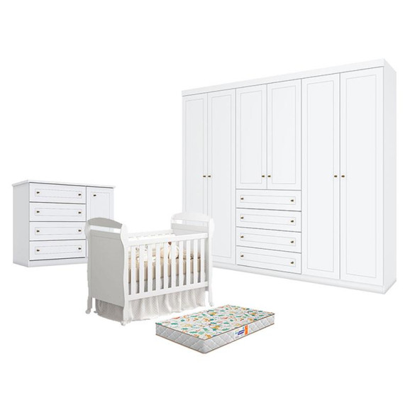 Quarto de Bebê Americano 6 Portas com Berço Danny Branco Acetinado Reller com Colchão Gazin - Henn