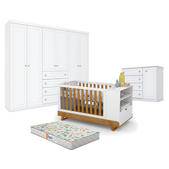 Quarto de Bebê Americano 6 Portas com Berço Multifuncional Bkids Branco Freijó Eco Wood - Matic - Henn com Colchão Gazin