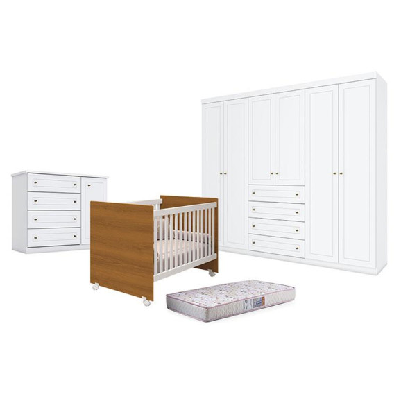 Quarto de Bebê Americano 6 Portas com Berço Nacional Mel Branco Savana – Reller - Henn com Colchão Gazin.