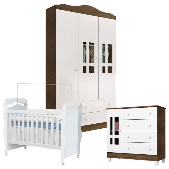 Quarto de Bebê Ariel 3 Portas com Berço New Nanda Branco Acetinado - Carolina