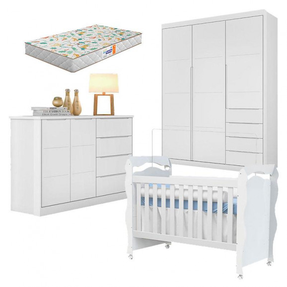 O bebê está chegando e você mamãe e papai precisam preparar um ambiente agradável para receber o seu pequeno. Um ambiente moderno com muito estilo que traz aquela tranquilidade e enche o coração de amor. Pensando nisso, temos disponíveis para vocês diferentes Modelos de Móveis infantis auxiliando ainda mais na hora de fazer a sua escolha. Guarda Roupa Blenda na cor Branco Acetinado lindo design e amplo espaço para facilitar na organização das roupinhas. Cômoda Blenda com 4 gavetas e 2 Portas com detalhes usinados, Berço Americano New Nanda que transforma-se em Mini Cama e possui Mosquiteiro. Colchão Gazin, desenvolvido para proporcionar uma melhor noite de sono para o seu pequeno. Aproveite!