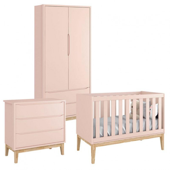 Quarto de Bebê Classic 2 Portas Rosa com Pés Madeira Natural – Reller