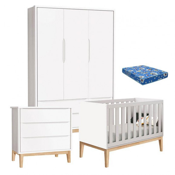 Quarto de Bebê Classic 3 Portas com Colchão e Cômoda Gaveteiro Branco Pés Madeira Natural - Reller