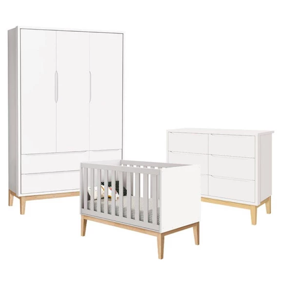 Quarto de Bebê Classic 3 Portas e Cômoda 6 Gavetas Branco com Pés Madeira Natural - Reller
