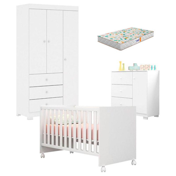 Quarto de Bebê Duda 3 Portas e Berço Americano Mini Cama Doce Sonho 100 Branco Brilho com Colchão Gazin – Phoenix Baby