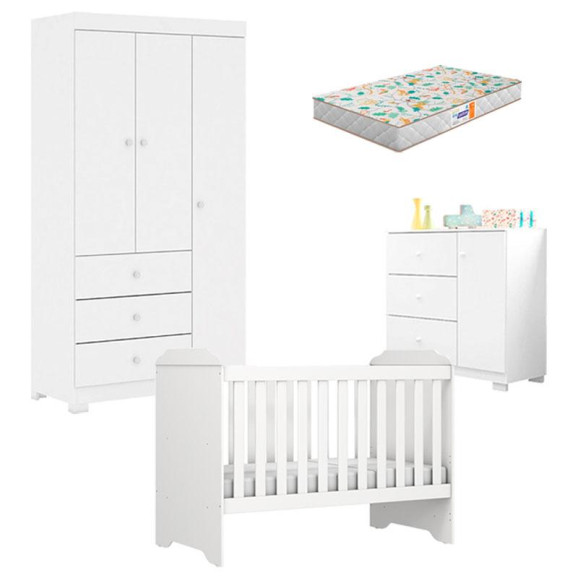 A mamãe começou a procurar móveis para o quartinho do seu bebê? Então apresentamos para você este belo conjunto composto pelo berço americano da linha Mel desenvolvido pela Carolina acompanhado do colchão Gazin, cômoda e guarda roupa 3 portas da linha Duda desenvolvido pela Phoenix Baby. O berço pode ser utilizado futuramente como mini cama, prolongando a sua vida útil. A cômoda possui três gavetas e uma porta. Já o guarda roupa conta com três portas e três gavetas, oferecendo um amplo espaço interno para a mamãe poder acomodar as roupinhas e acessórios do seu filho. São fabricados em MDP/ MDF da mais alta qualidade, garantindo mais durabilidade e resistência. Esse conjunto irá combinar com qualquer ambiente, além de ser projetado para acompanhar todas as fases de crescimento do seu filho. Confira as características: