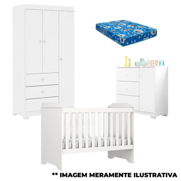 Quarto de Bebê Duda 3 Portas e Berço Americano Mini Cama Mel Branco Brilho com Colchão – Phoenix Baby