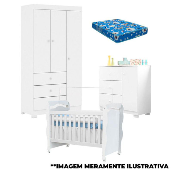 Quarto de Bebê Duda 3 Portas e berço Americano New Nanda Branco Brilho com Colchão – Phoenix Baby