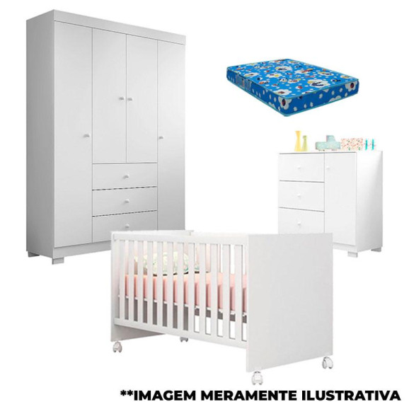 A mamãe está montando o quartinho do seu bebê? Apresentamos para você este belo conjunto composto pelo berço americano da linha Doce Sonho fabricado pela Qmovi acompanhado do colchão para berço americano, cômoda e guarda roupa 4 portas da linha Duda fabricado pela Phoenix Baby. O berço possui a função de se transformar em uma mini cama, prolongando a sua vida útil. A cômoda tem três gavetas e uma porta, já o guarda roupa possui quatro portas e três gavetas. Tendo um ótimo espaço interno para guardar as roupinhas e itens. Desenvolvidos em MDP/ MDF de alta qualidade, garante mais durabilidade e resistência. Esse conjunto será ideal para acompanhar todas as fases de crescimento do seu filho, além de oferecer mais conforto para o bebê e praticidade para a mamãe. Confira as características: