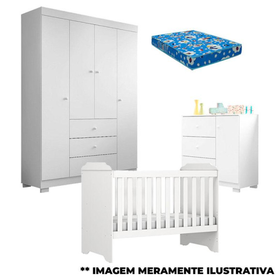 Quarto de Bebê Duda 4 Portas e Berço Americano Mini Cama Mel Branco Brilho com Colchão – Phoenix Baby