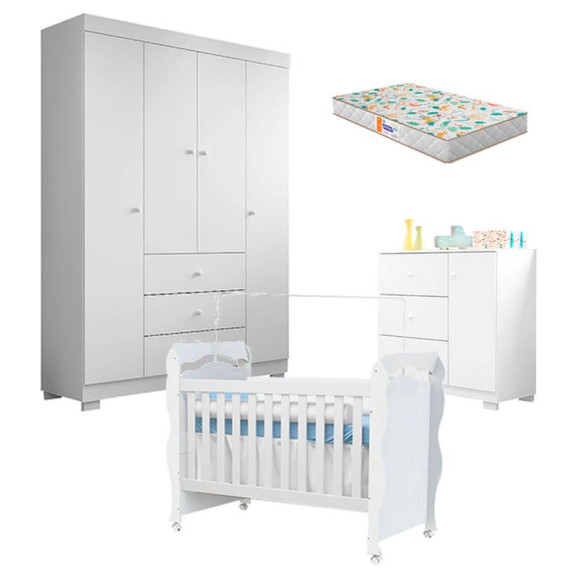 Quarto de Bebê Duda 4 Portas e Berço Americano New Nanda Branco Brilho com Colchão Gazin – Phoenix Baby