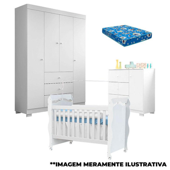 Quarto de Bebê Duda 4 Portas e Berço Americano New Nanda Branco Brilho com Colchão – Phoenix Baby