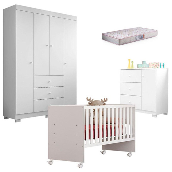 Quarto de Bebê Duda 4 Portas e Berço Nacional Doce Sonho 3540 Branco Brilho com Colchão Gazin – Phoenix Baby