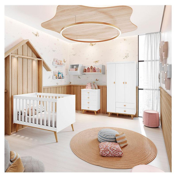 Quarto de Bebê Duda com Gaveteiro Ambiente e Berço Americano Ludmila Branco Acetinado Bétula - Carolina