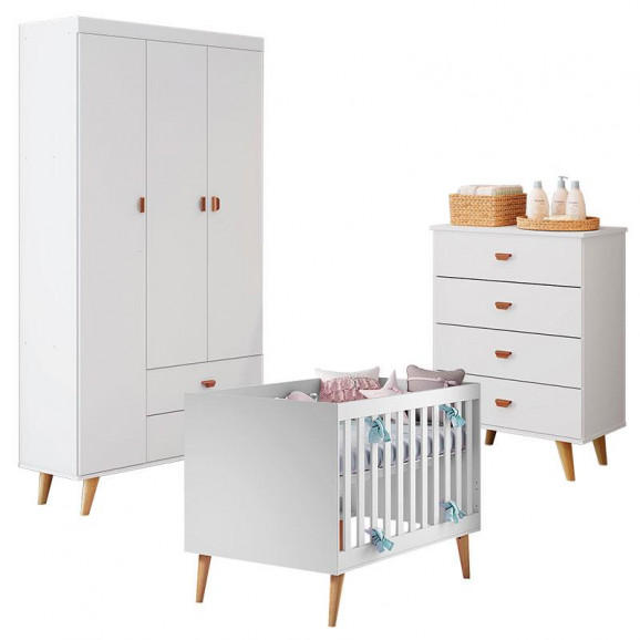 Escolher os móveis para o quarto do bebê não é uma tarefa fácil não é mesmo, mas estamos aqui para lhe ajudar, apresentamos a vocês essa linda opção de jogo de quarto infantil composto por Berço Americano da linha Ludmila que se transforma em mini cama e sofá cama aumentando a vida útil do móvel acompanhando as fases de crescimento da criança, a Cômoda com 4 Gavetas e o Guarda Roupa 3 Portas da linha Duda conta com amplo espaço interno e ótimas repartições para maior praticidade e organização das roupinhas, sapatinhos e acessórios do seu baby, sistema de Travas Anti-Tombamento fixados na parede para segurança de todos evitando acidentes, lindo e delicado design na cor Branco Acetinado com Pés estilo Retrô na cor Bétula proporcionando modernidade e tranquilidade ao ambiente, desenvolvidos pela Carolina Baby com todo cuidado e carinho para sua família, fabricado com materiais de excelentes qualidades, resistência e durabilidade. Não deixe de conferir e garantir o seu!